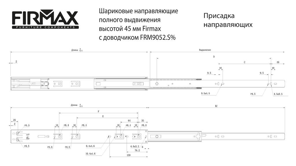 Направляющие шариковые Firmax Soft-Close полного выдвижения, H=45 мм, L=400 мм, цинк (2 части), толщина 1,2*1,2*1,5мм