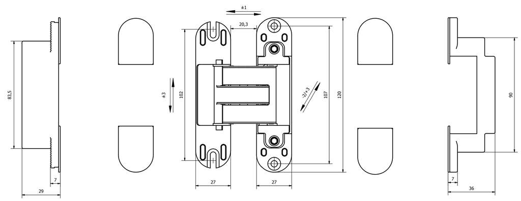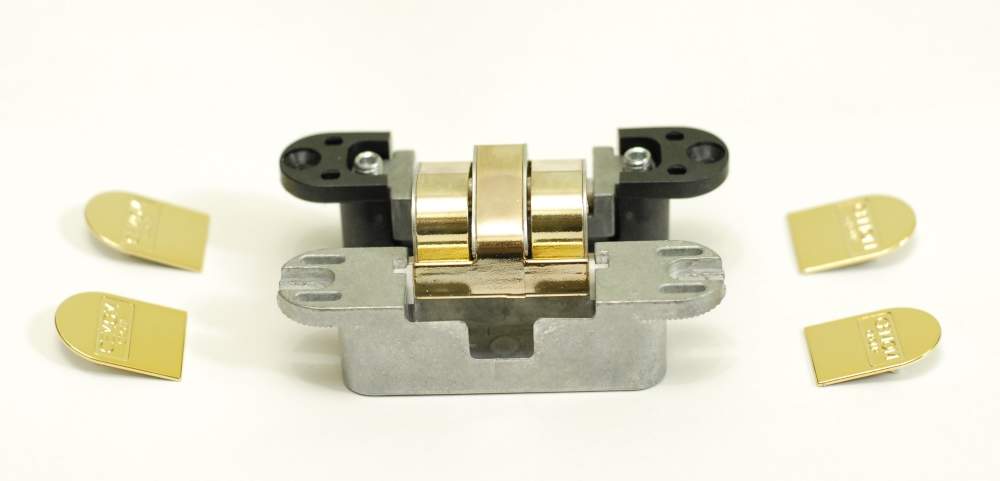 Петля дверная скрытая универсальная, 3D, 120×27 мм, 60 кг, латунь, с 4 пласт. колпачками