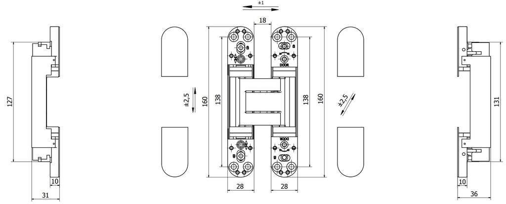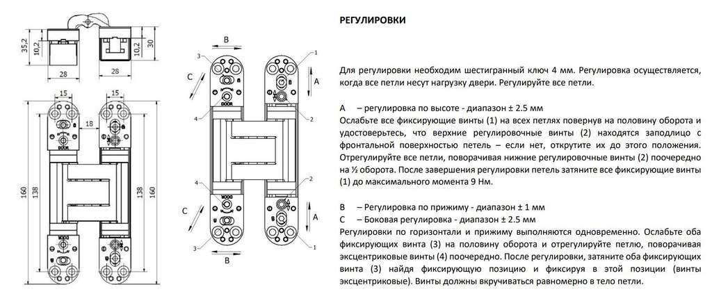 Петля дверная скрытая универсальная, 3D, 160х28 мм, 100 кг, сатин хром., с 4 металл. колпачками
