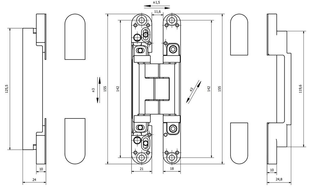 Петля дверная скрытая универсальная, 3D, 155×18/21 мм, 80 кг, черный мат., с 4 алюм. колпачками
