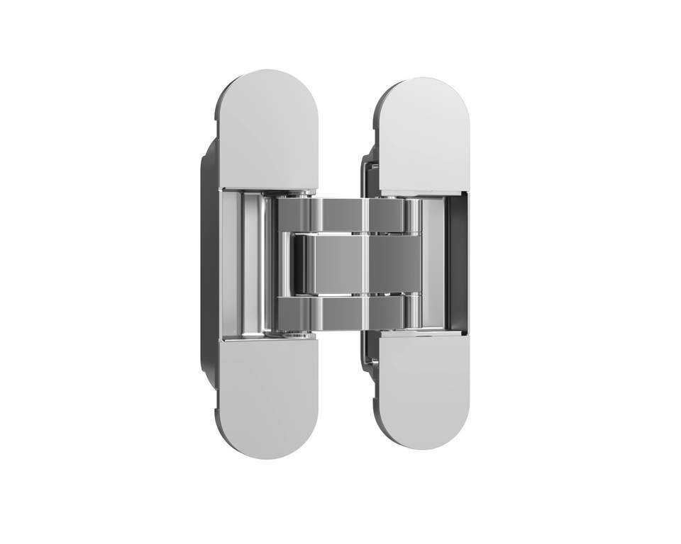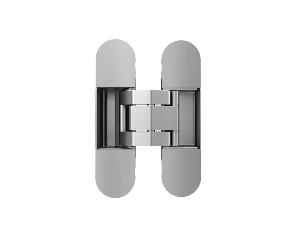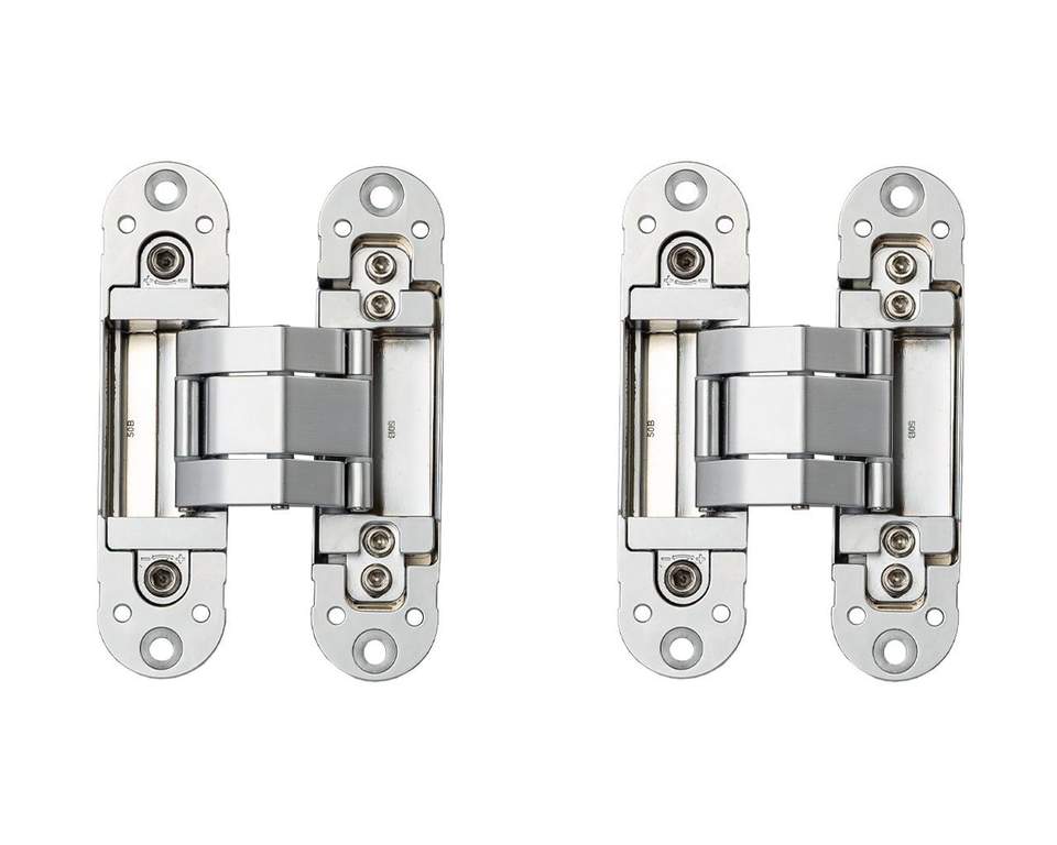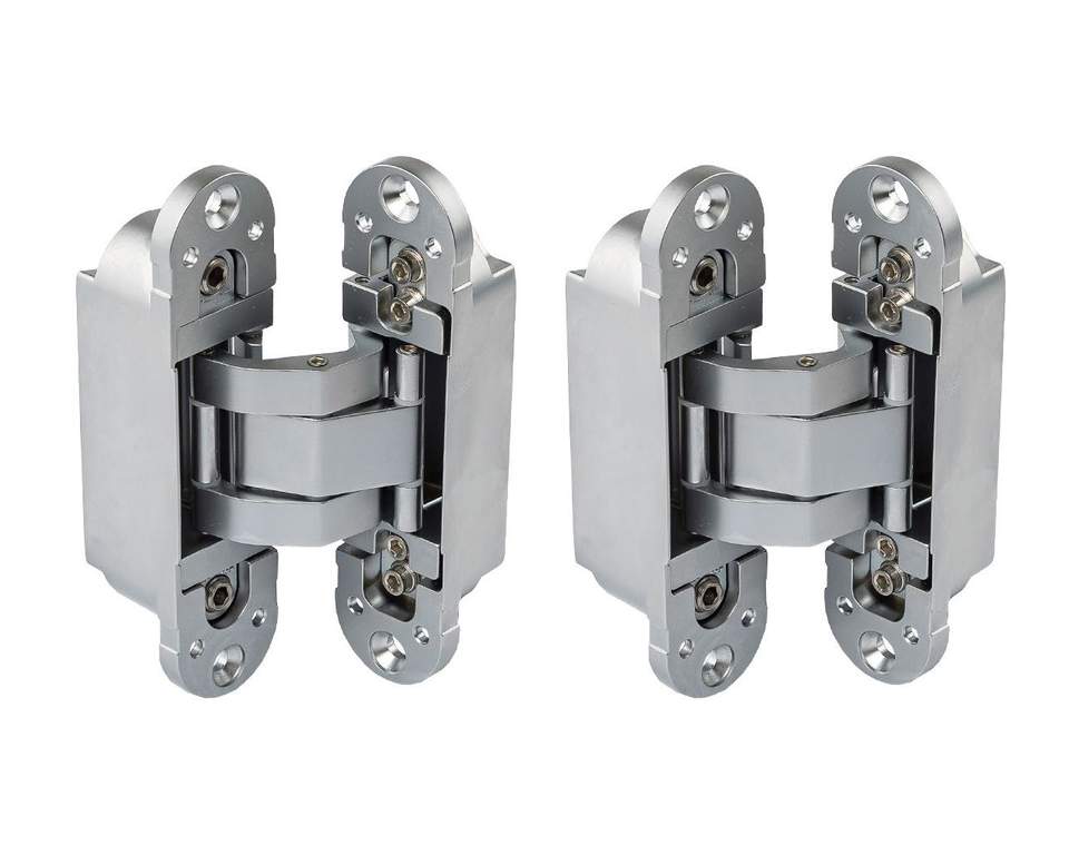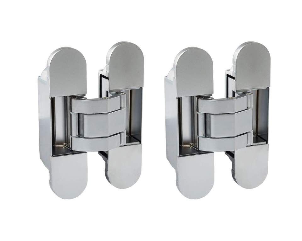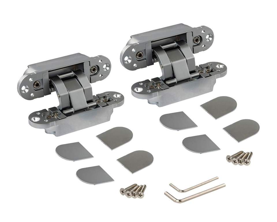 Петля скрытая ELEMENTIS, универсальна, 3D, 120×30 мм, 50 кг, цамак, серебро матовое, в комплекте 2 петли,8 пласт. колпачков,8 винтов,2 рег.ключа,1 инструкция
