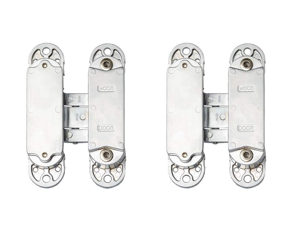 - Петля скрытая ELEMENTIS, универсальна, 3D, 120×30 мм, 50 кг, цамак, серебро матовое, в комплекте 2 петли,8 пласт. колпачков,8 винтов,2 рег.ключа,1 инструкция