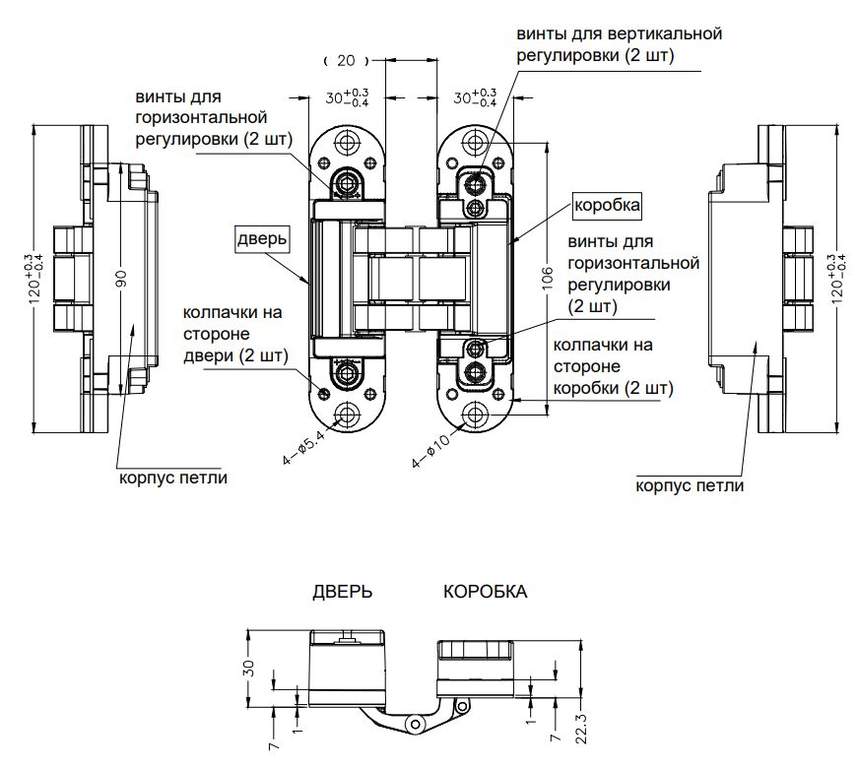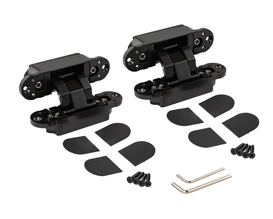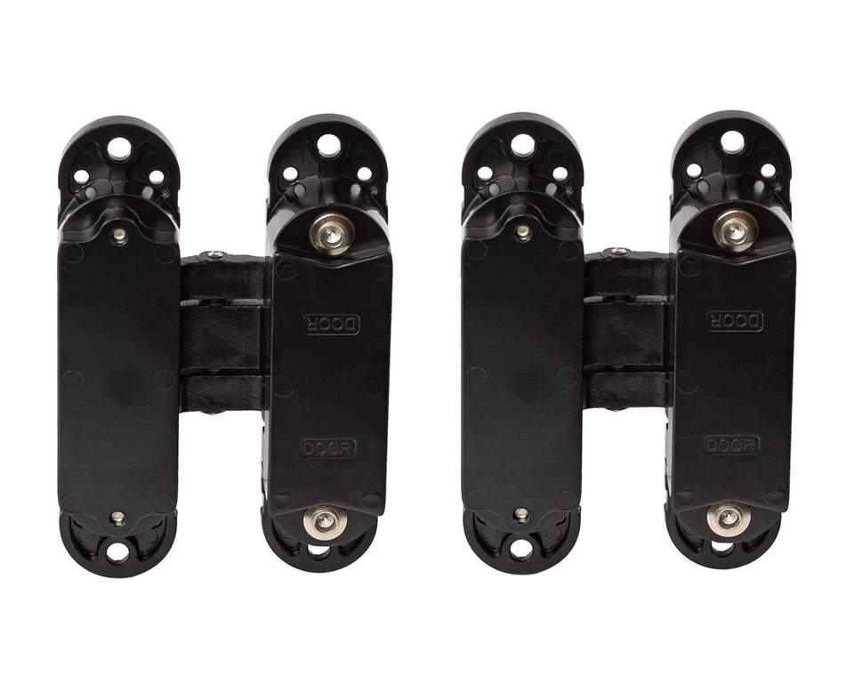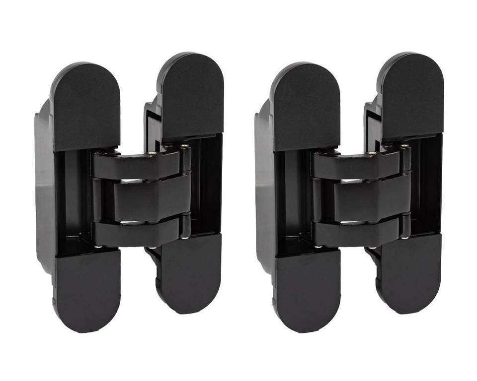 - Петля скрытая ELEMENTIS, универсальная, 3D, 120×30 мм, 50 кг, цамак, черная матовая, в комплекте 2 петли,8 пласт. колпачков,8 винтов,2 рег.ключа,1 инструкция