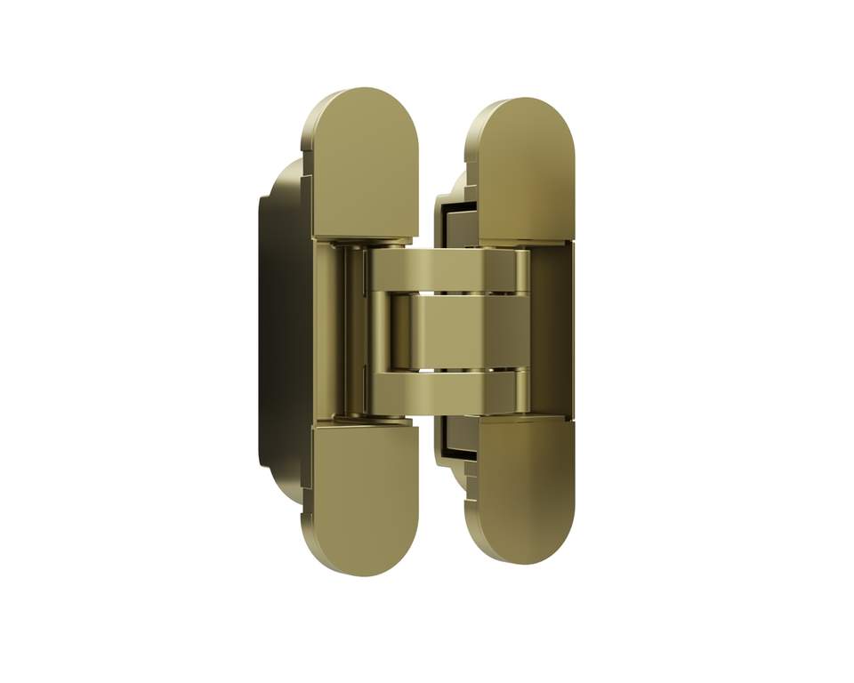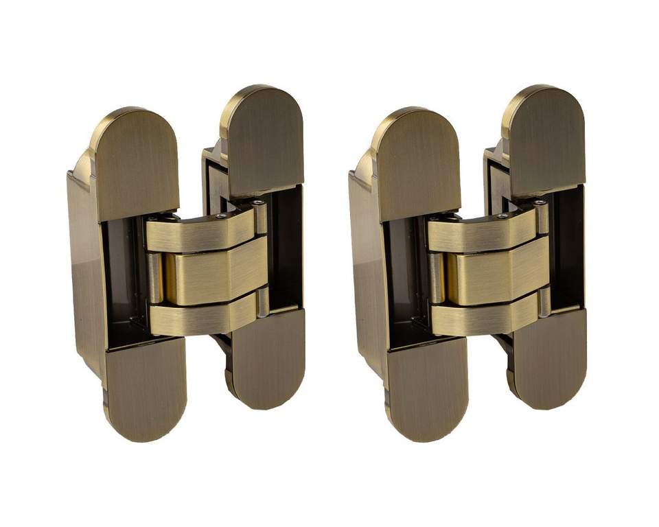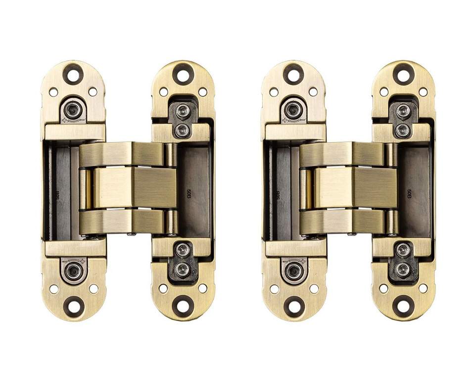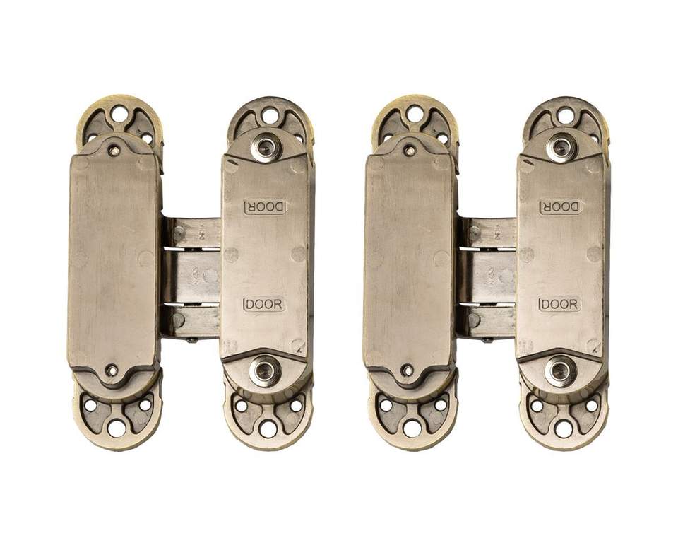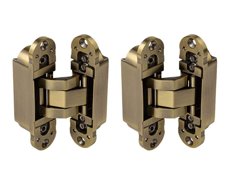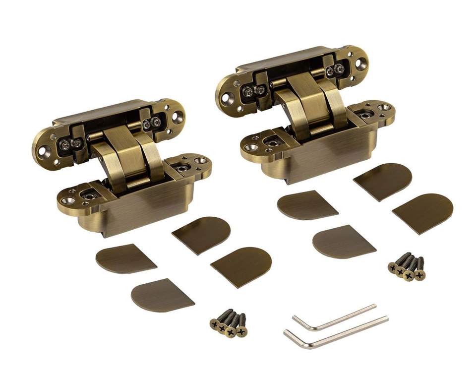 - Петля скрытая ELEMENTIS, универсальная, 3D, 120×30 мм, 50 кг, цамак, бронза античная, в комплекте 2 петли,8 пласт. колпачков,8 винтов,2 рег.ключа,1 инструкция