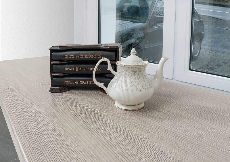 Для соединения пленки Elesgo-Plus on top ® с основой подоконника используется полиуретановый экологически безопасный высококачественный клей-расплав KLEIBERIT. Он обеспечивает очень прочное сцепление ламината с основой, и длительный срок эксплуатации подоконника Moeller.